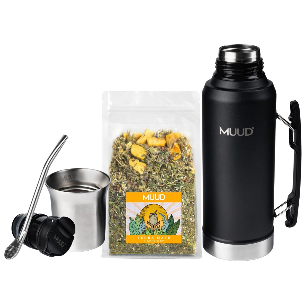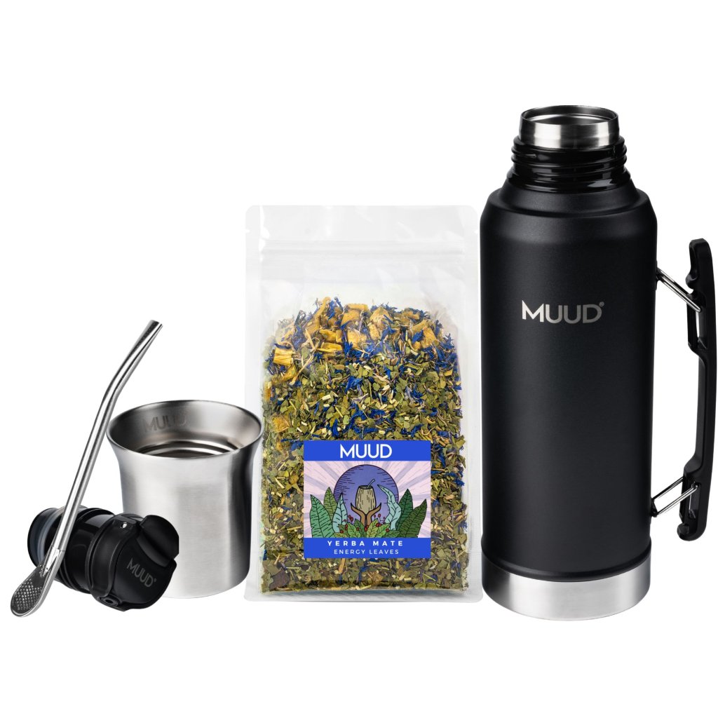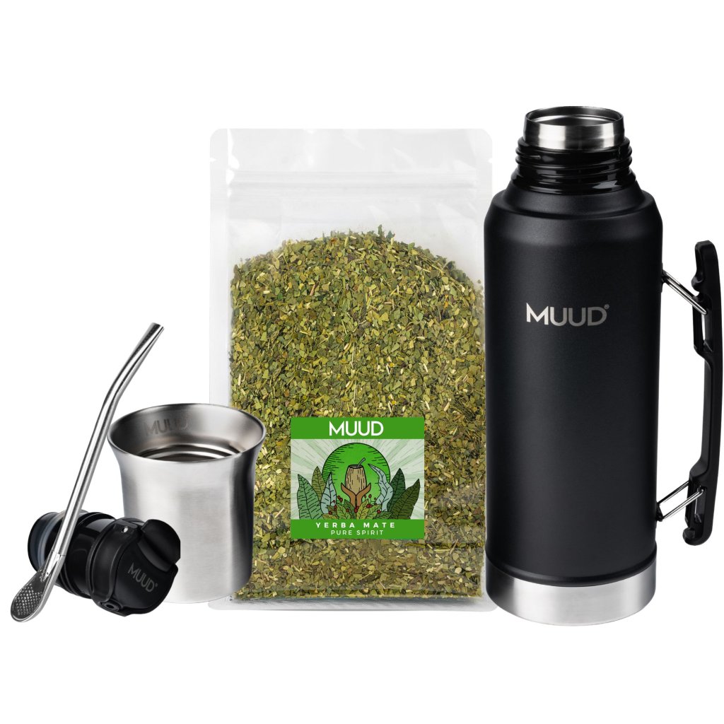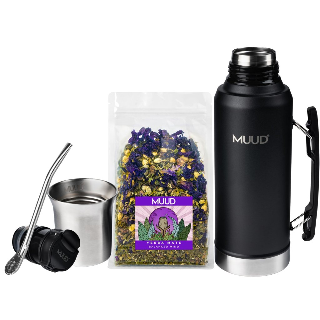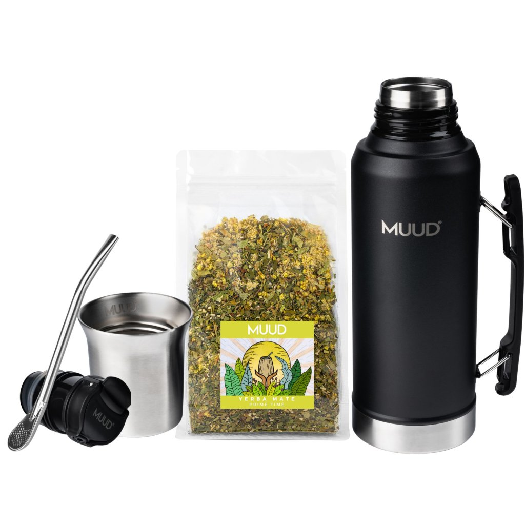 Set s termoláhví z dvojstěnné nerezové oceli, praktická ocelová kalabasa a speciální FlowSystem uzávěr pro dokonale přesné nalévání vody. To je nový MUUD FlowSystem. Právě teď v setu s Yerba Mate dle výběru a brčkem s filtrem, bombillou.