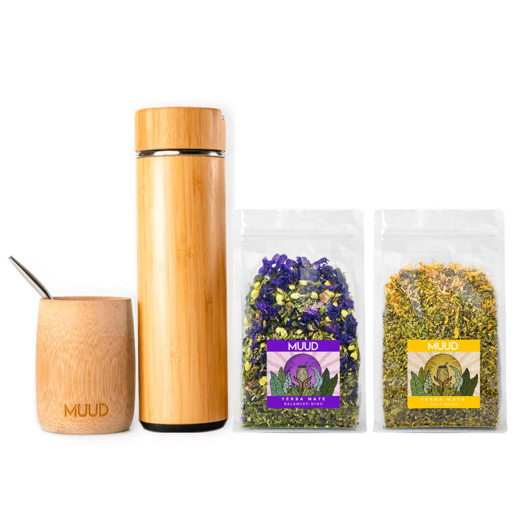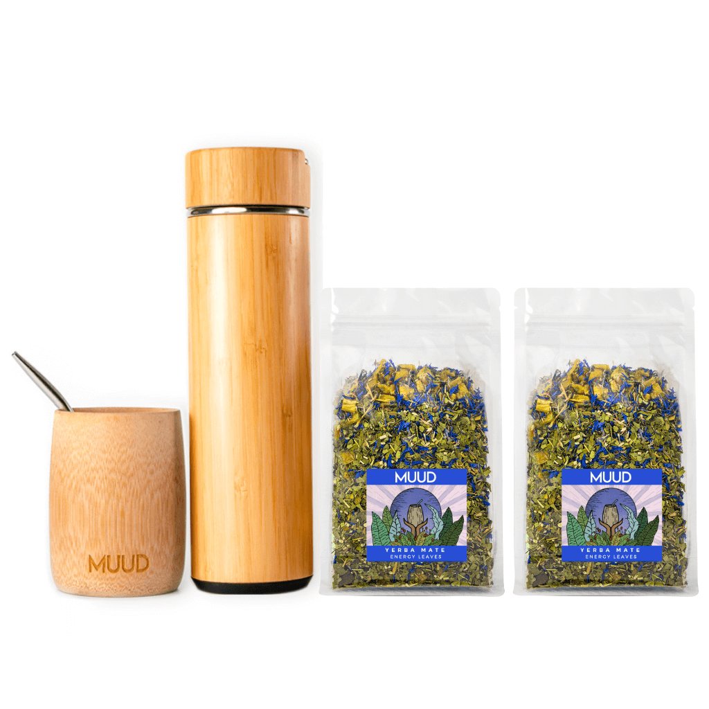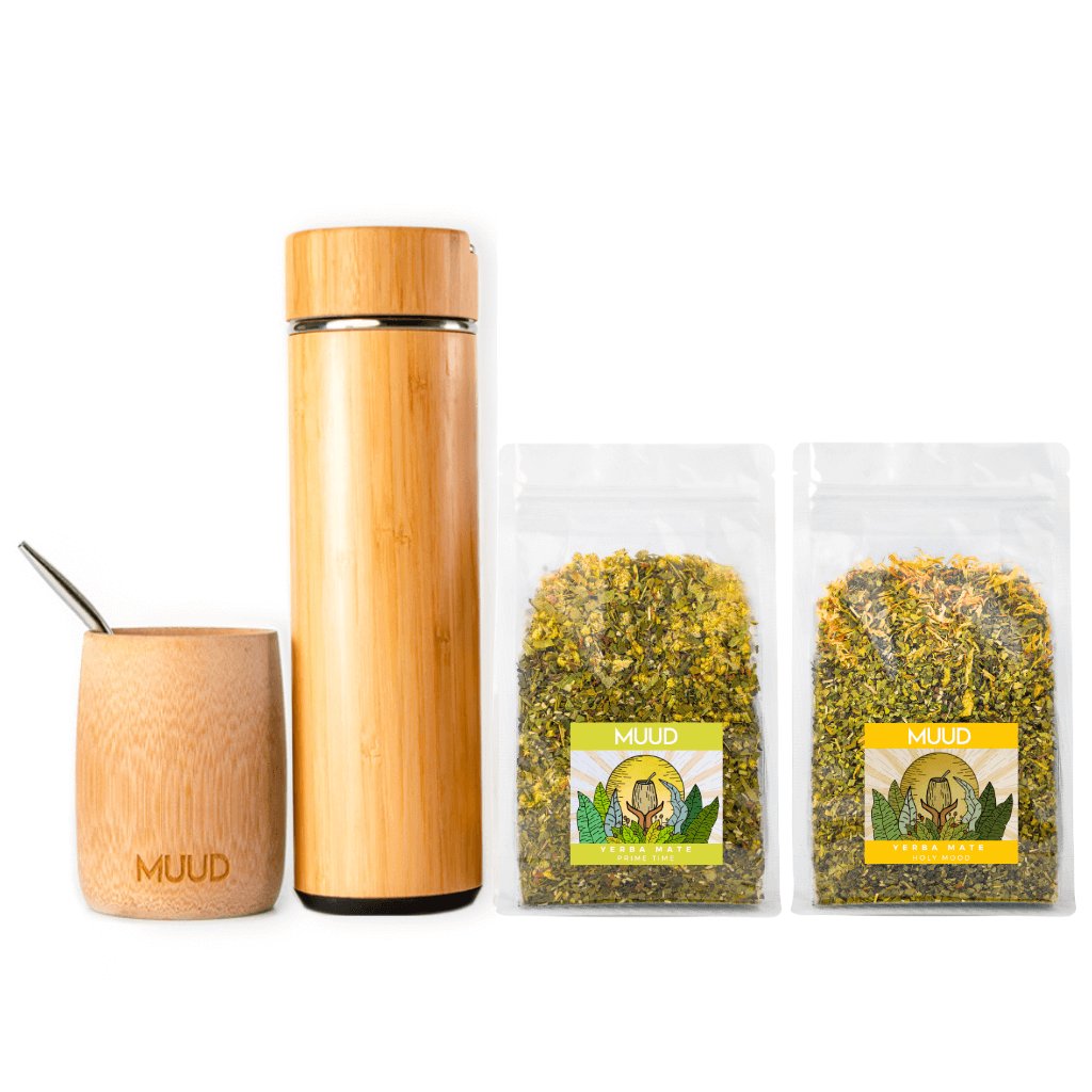 Dva z našich skvěle vyladěných mixů a esteticky příjemné přírodní vybavení v jednom cenově zvýhodněném setu. Yerba Mate obsahuje téměř všechny látky, které lidské tělo potřebuje, a které spolu navíc působí v synergii. Díky tomu Yerba Mate skutečně pomáhá proti fyzické i psychické únavě. MUUD Starterpack je nejlepší způsob, jak vstoupit do světa Yerba Mate.