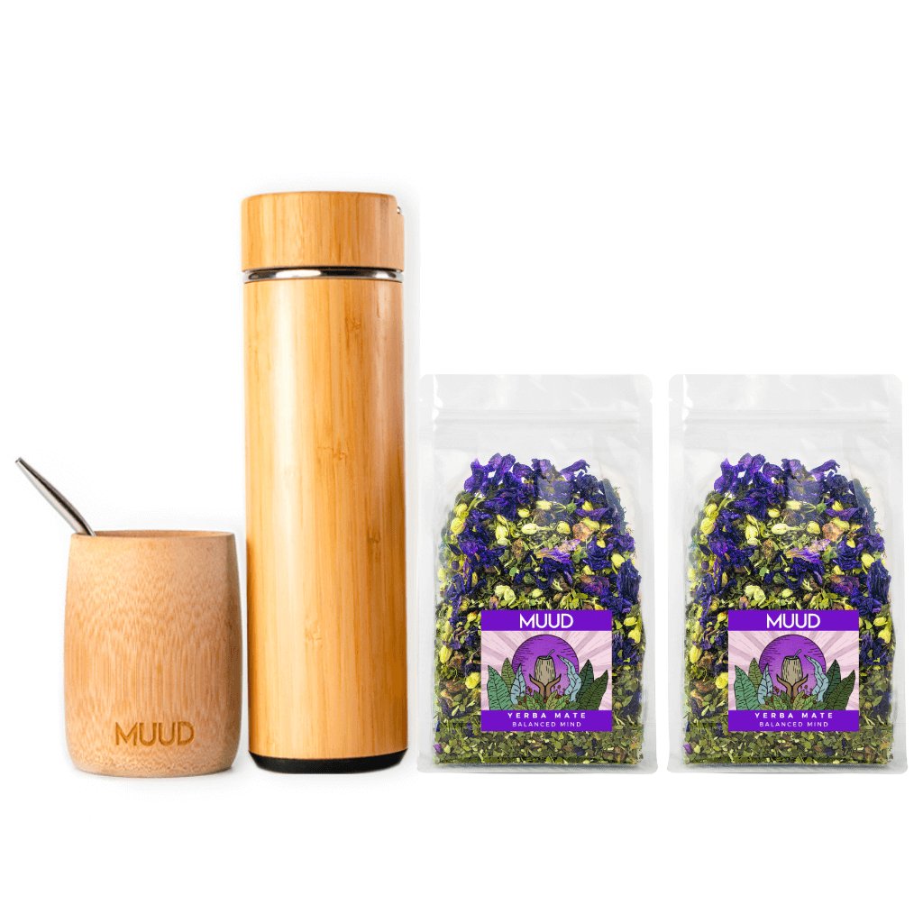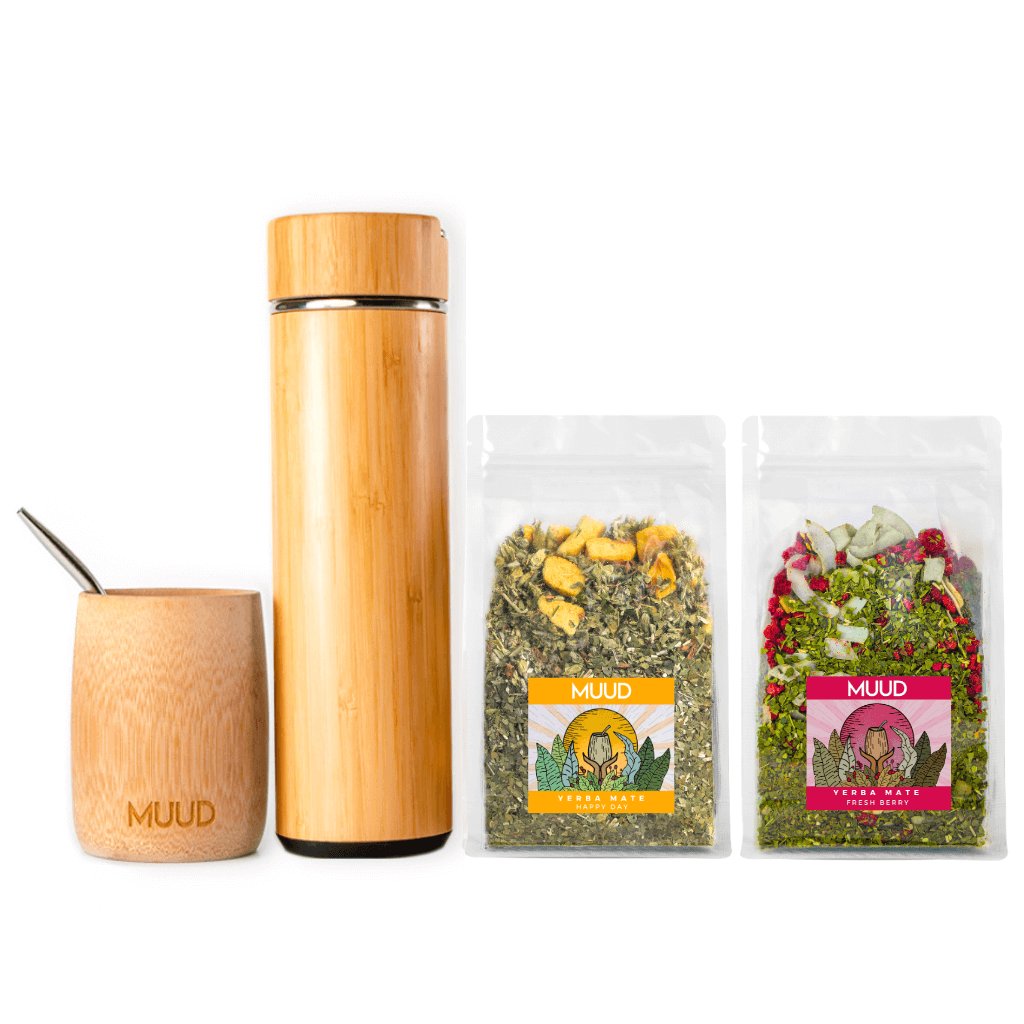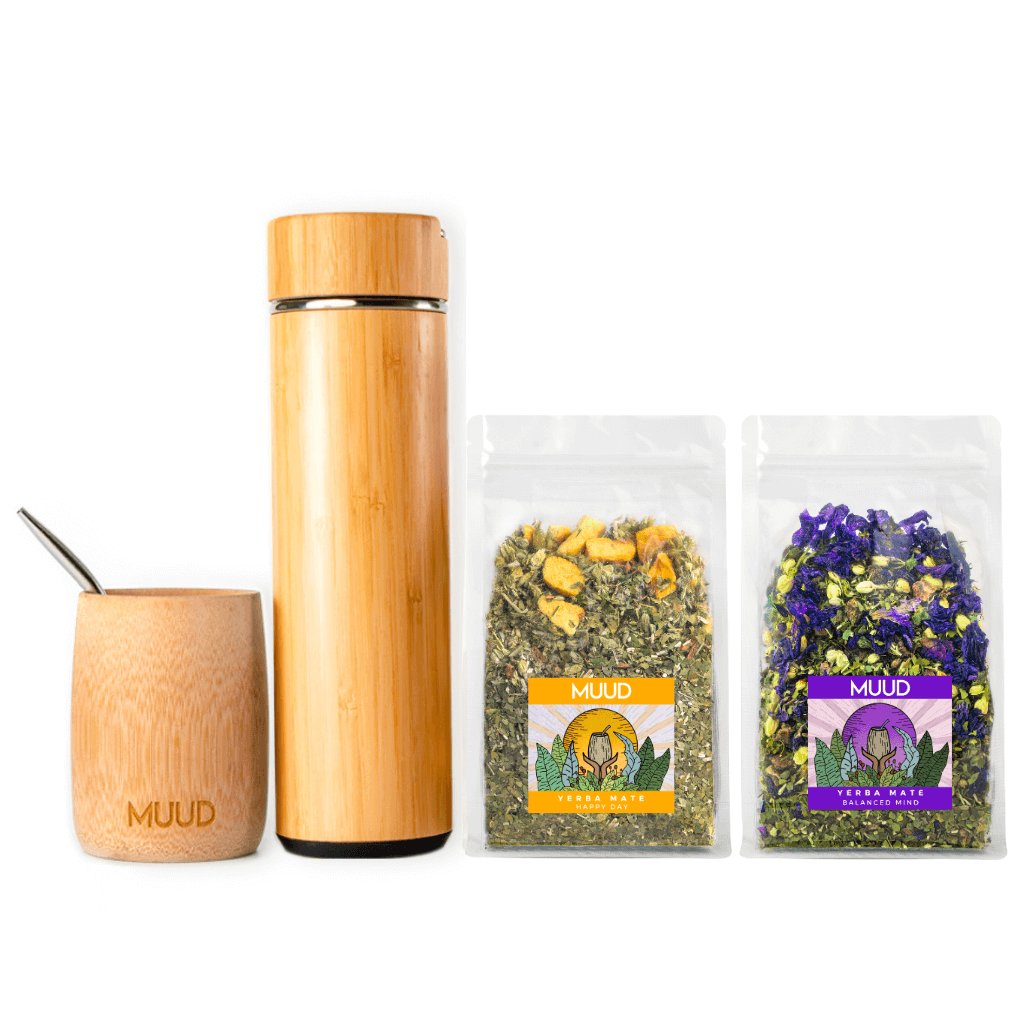 Dva z našich skvěle vyladěných mixů a esteticky příjemné přírodní vybavení v jednom cenově zvýhodněném setu. Yerba Mate obsahuje téměř všechny látky, které lidské tělo potřebuje, a které spolu navíc působí v synergii. Díky tomu Yerba Mate skutečně pomáhá proti fyzické i psychické únavě. MUUD Starterpack je nejlepší způsob, jak vstoupit do světa Yerba Mate.